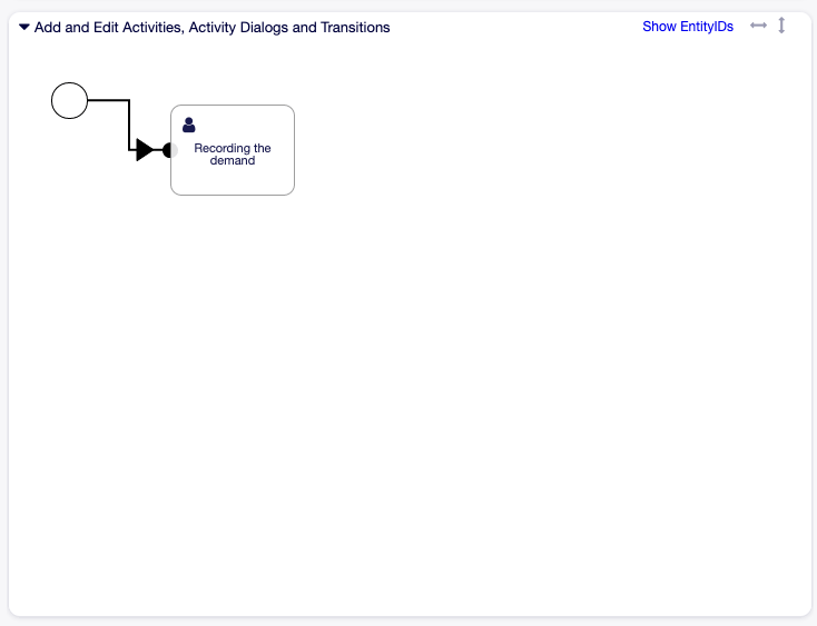 Assuming that the activities have already assigned their activity dialogs, drag an activity from the accordion in the Available Process Elements widget in the left sidebar and drop it into the canvas area below the process information. Notice that an arrow from the process start (white circle) to the activity is placed automatically. This is the first activity and its first activity dialog is the first screen that will be shown when the process starts.