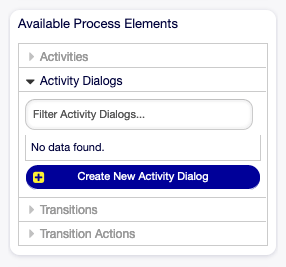 Click on the Activities item in the Available Process Elements widget in the left sidebar. This action will expand the Activities options and will collapse all others doing an accordion like effect. Click on the Create New Activity button.
