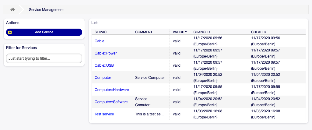 Use this screen to add services to the system. A fresh OTOBO installation doesn't contain any services by default. The service management screen is available in the Services module of the Ticket Settings group.