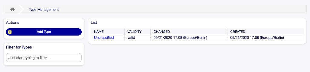 Use this screen to add types to the system. A fresh OTOBO installation contains an unclassified type by default. The type management screen is available in the Types module of the Ticket Settings group.