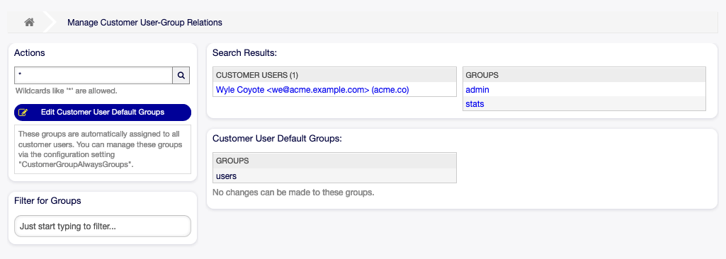 If several customer users or groups are added to the system, use the search box to find a particular customer user or use the filter box to find a particular group by just typing the name to filter.