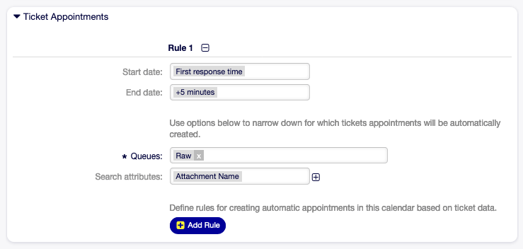 Define rules for creating automatic appointments in this calendar based on ticket data. To add a new rule, click on the Add Rule button.